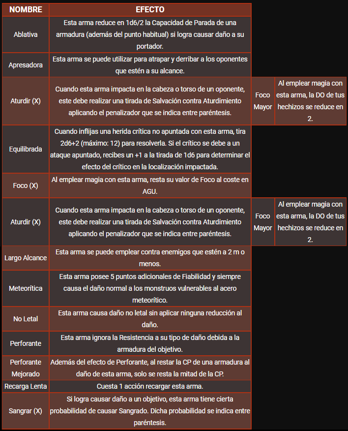 Bajo el título Efecto se describen las capacidades adicionales que puede tener un arma.